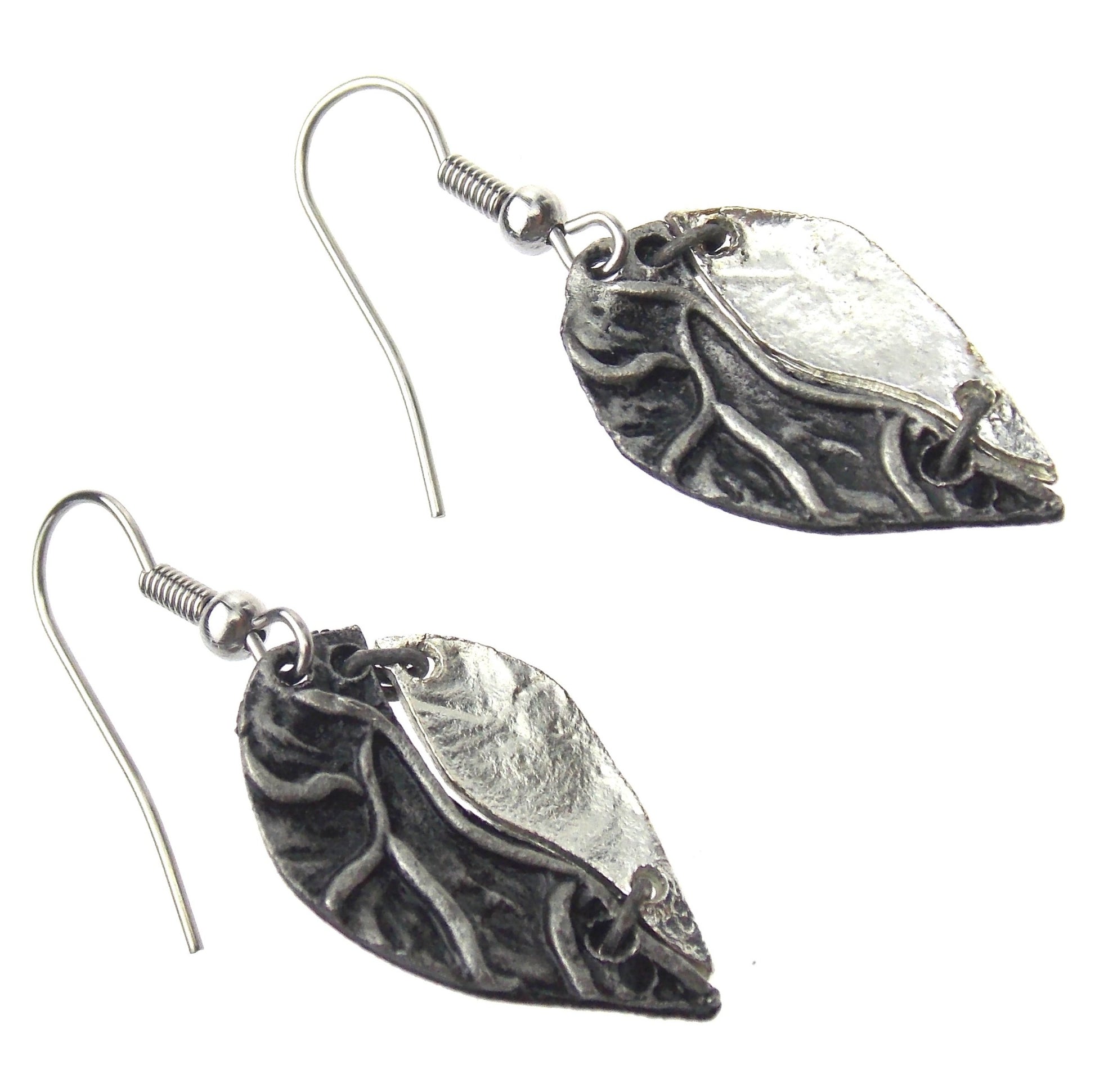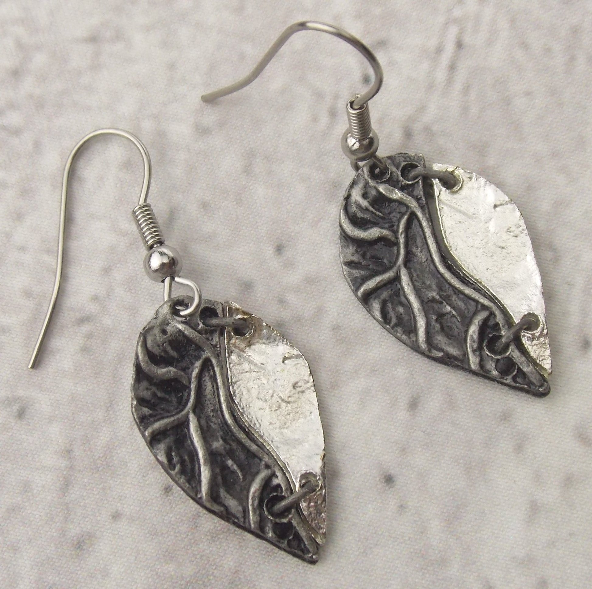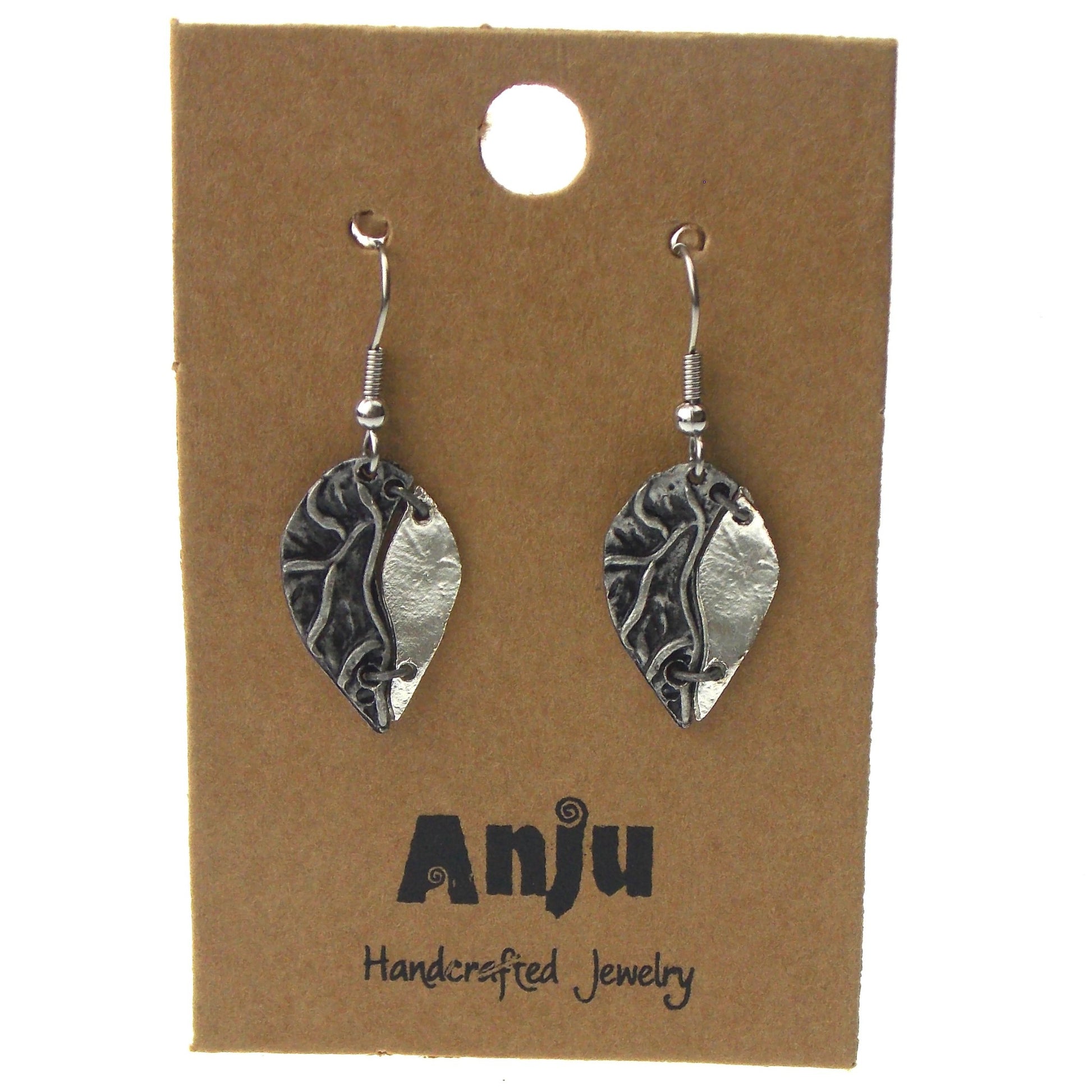 Anju Pewter Leaf Shaped Earrings Handcrafted Dangle Hook Boho Two Tone Natural