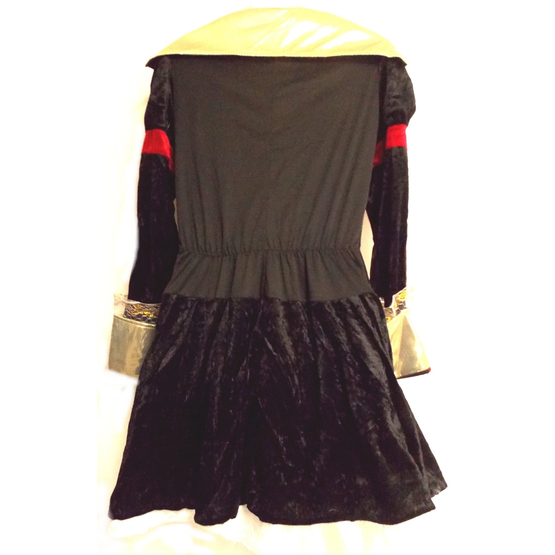 Black, Red Dress with Gold & White Lace trim & gold chains in front.