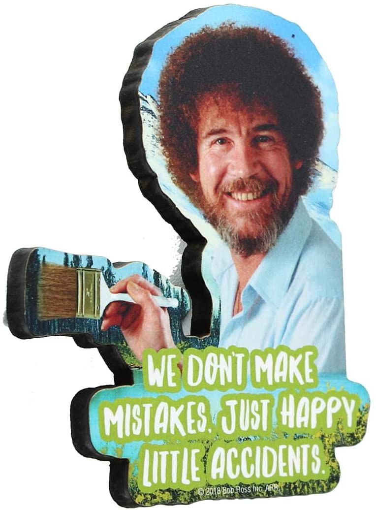 The magnet features an image of a Bob Ross painting and says "We don't make mistakes, just happy little accidents".
