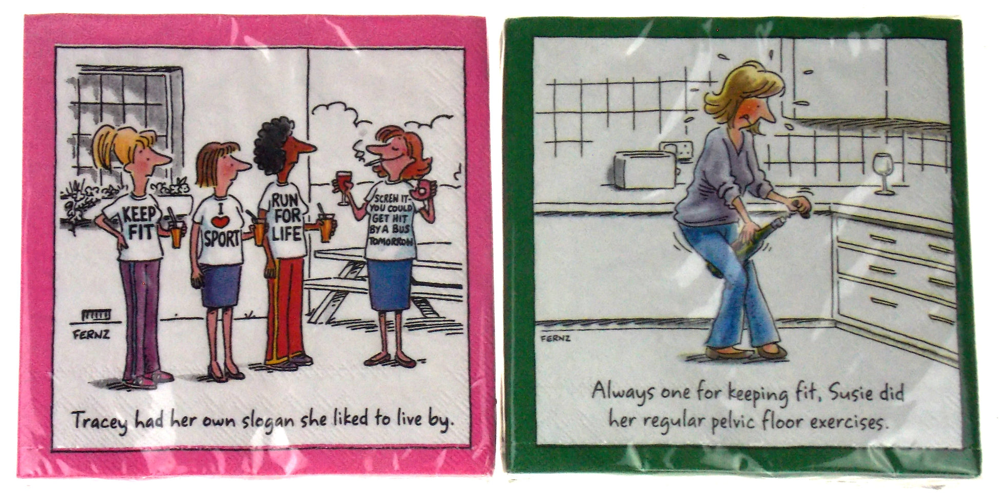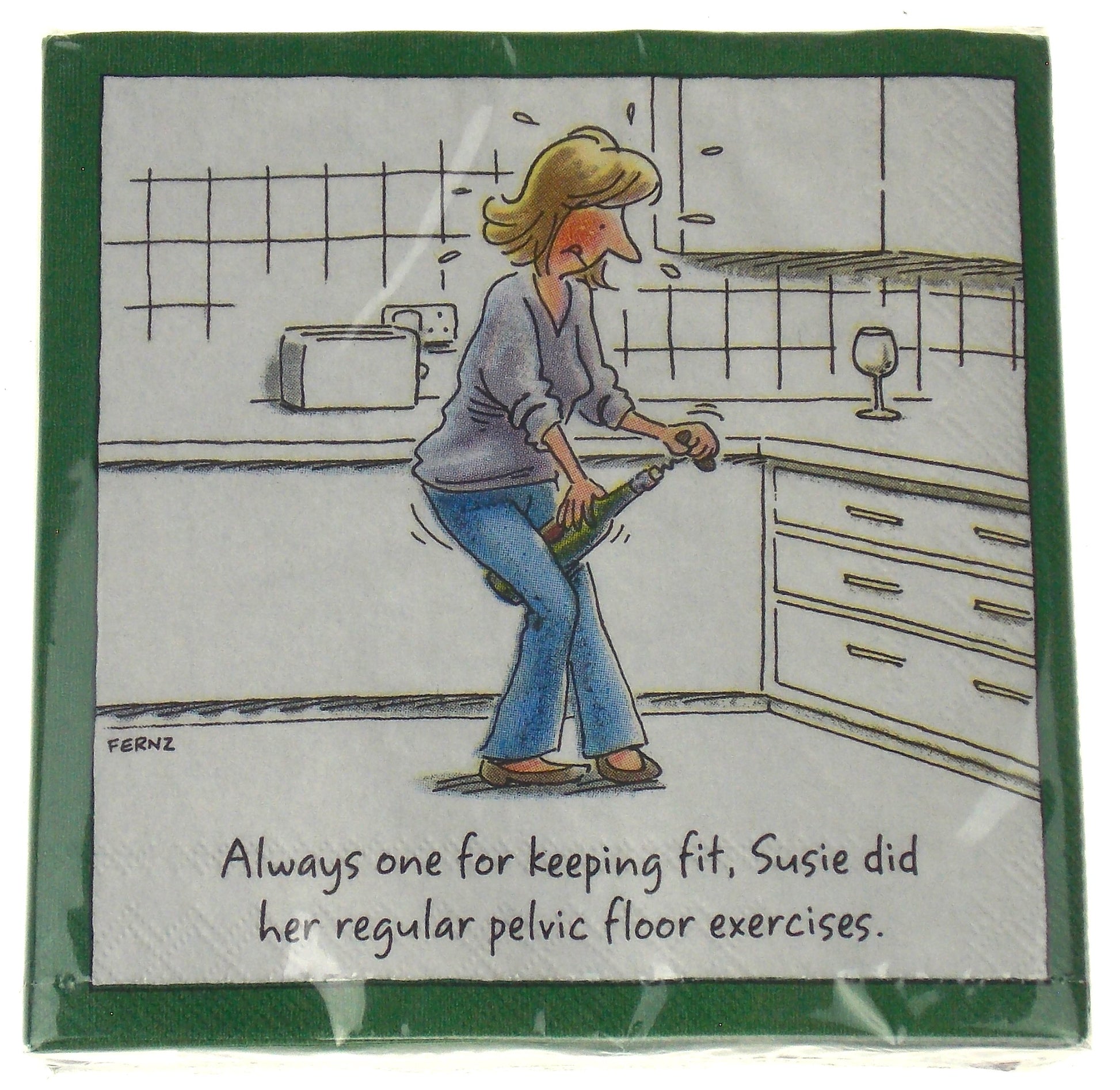 KEEPING FIT NAPKIN - White napkin with green border. Cartoon image of lady in the kitchen working hard to open a bottle of wine with a corkscrew. The napkin says "Always one for keeping fit, Susie did her regular pelvic floor exercises".