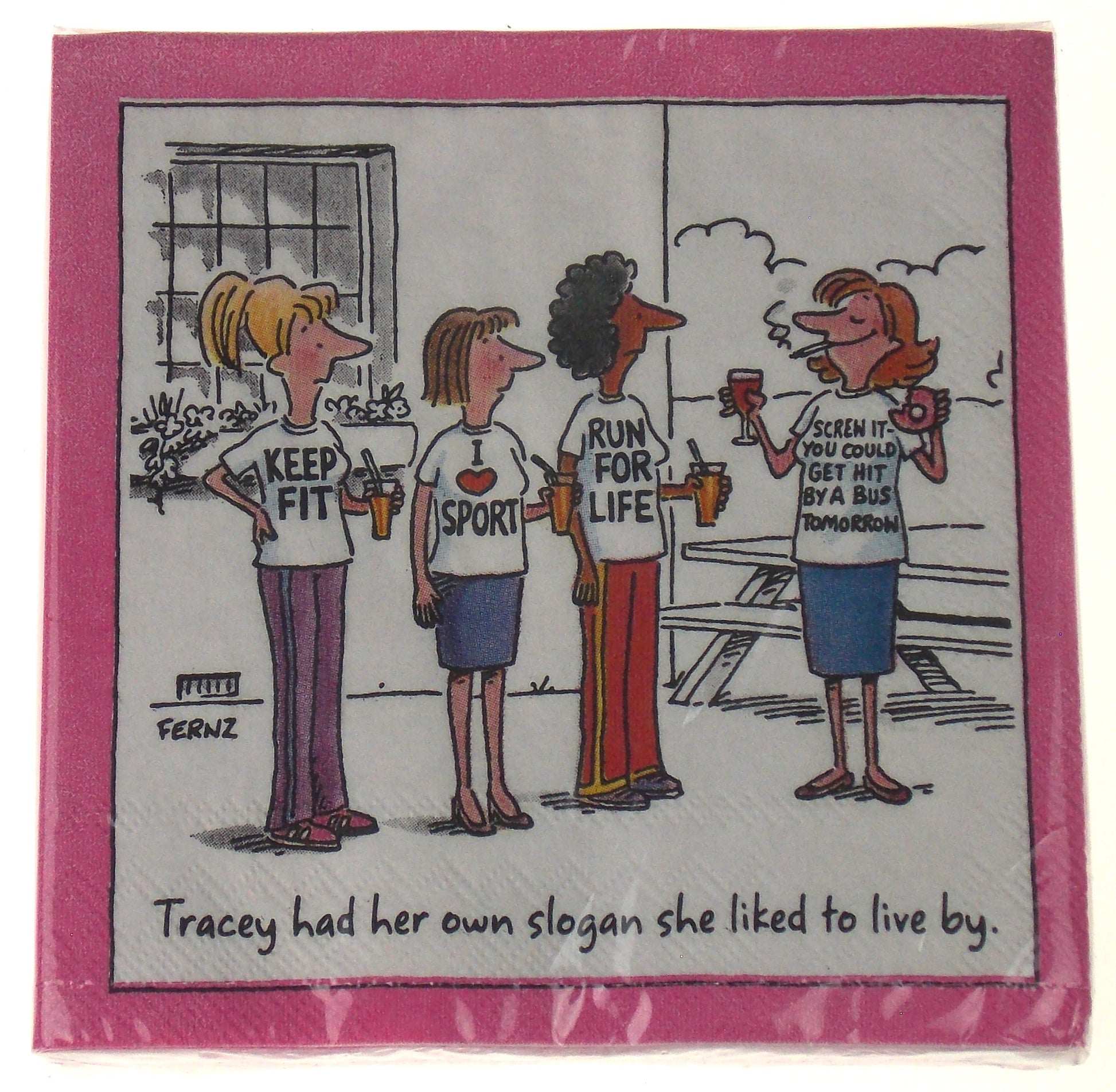 SLOGAN NAPKIN - White napkin with pink border. Cartoon image with 4 ladies each with a shirt with slogans on them. "Keep Fit", "I Love Sport", "Run For Life", & "Screw It, You Could Get Hit By A Bus Tomorrow". The Napkin on the bottom says "Tracey had her own slogan she liked to live by".