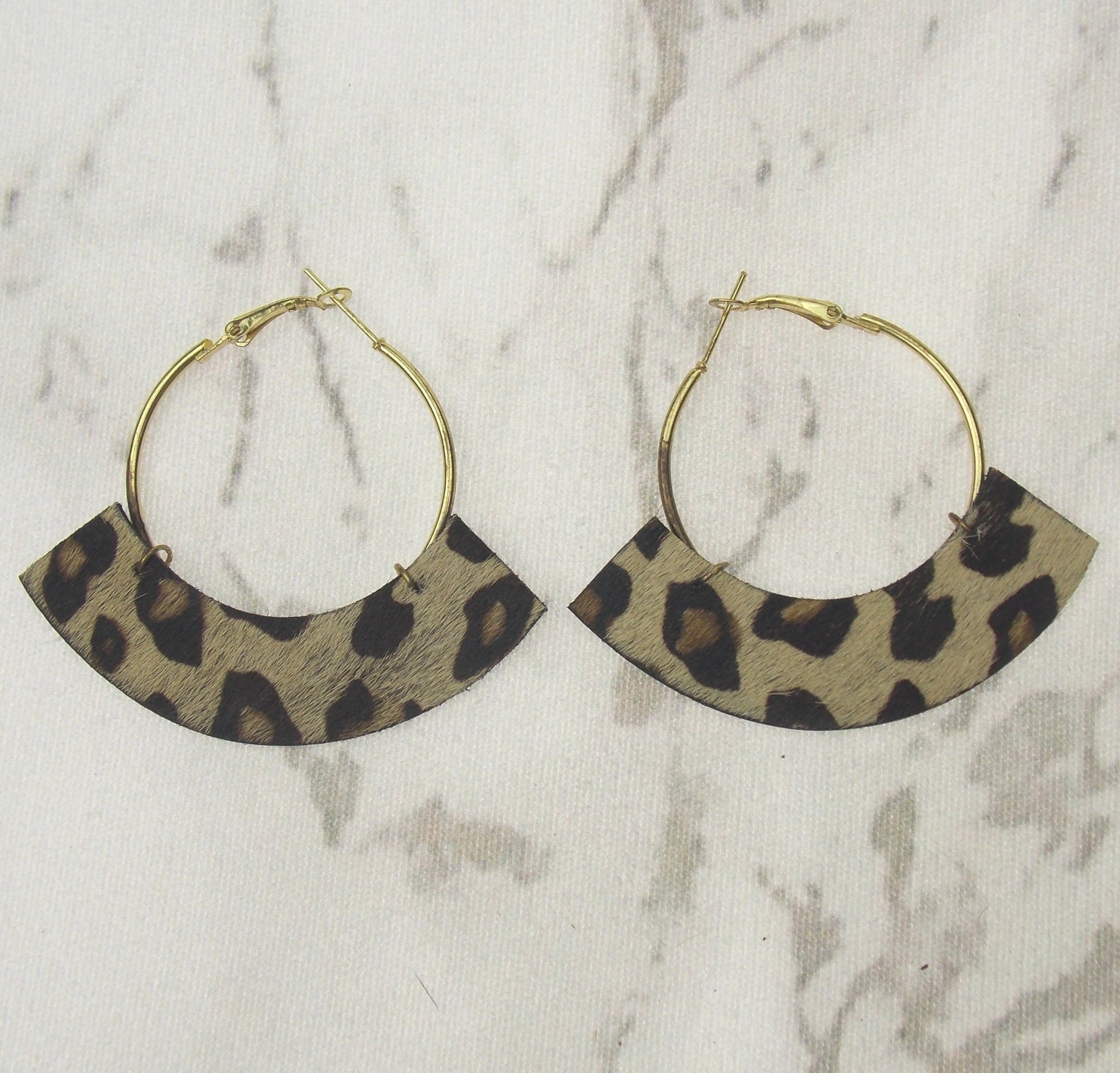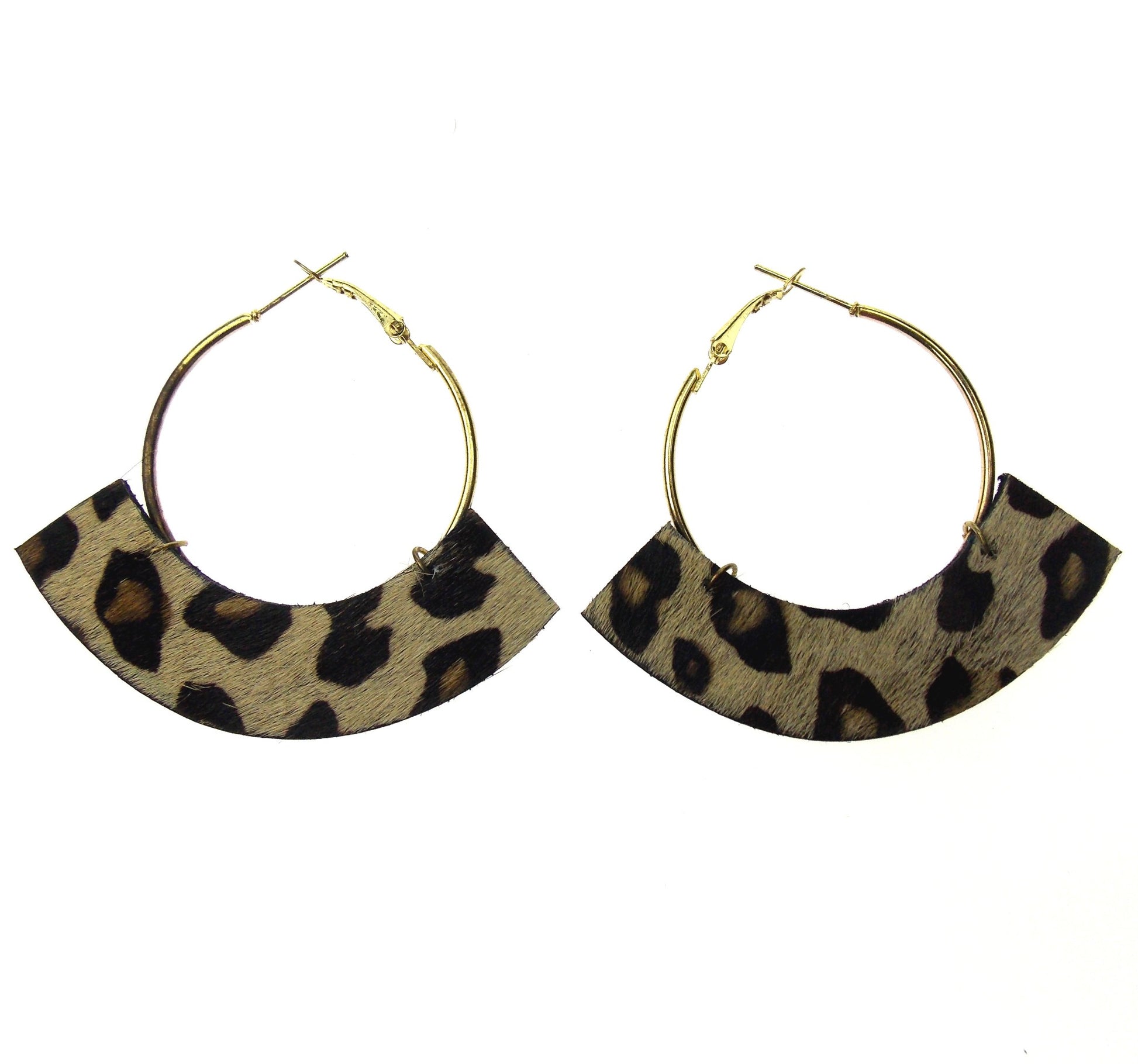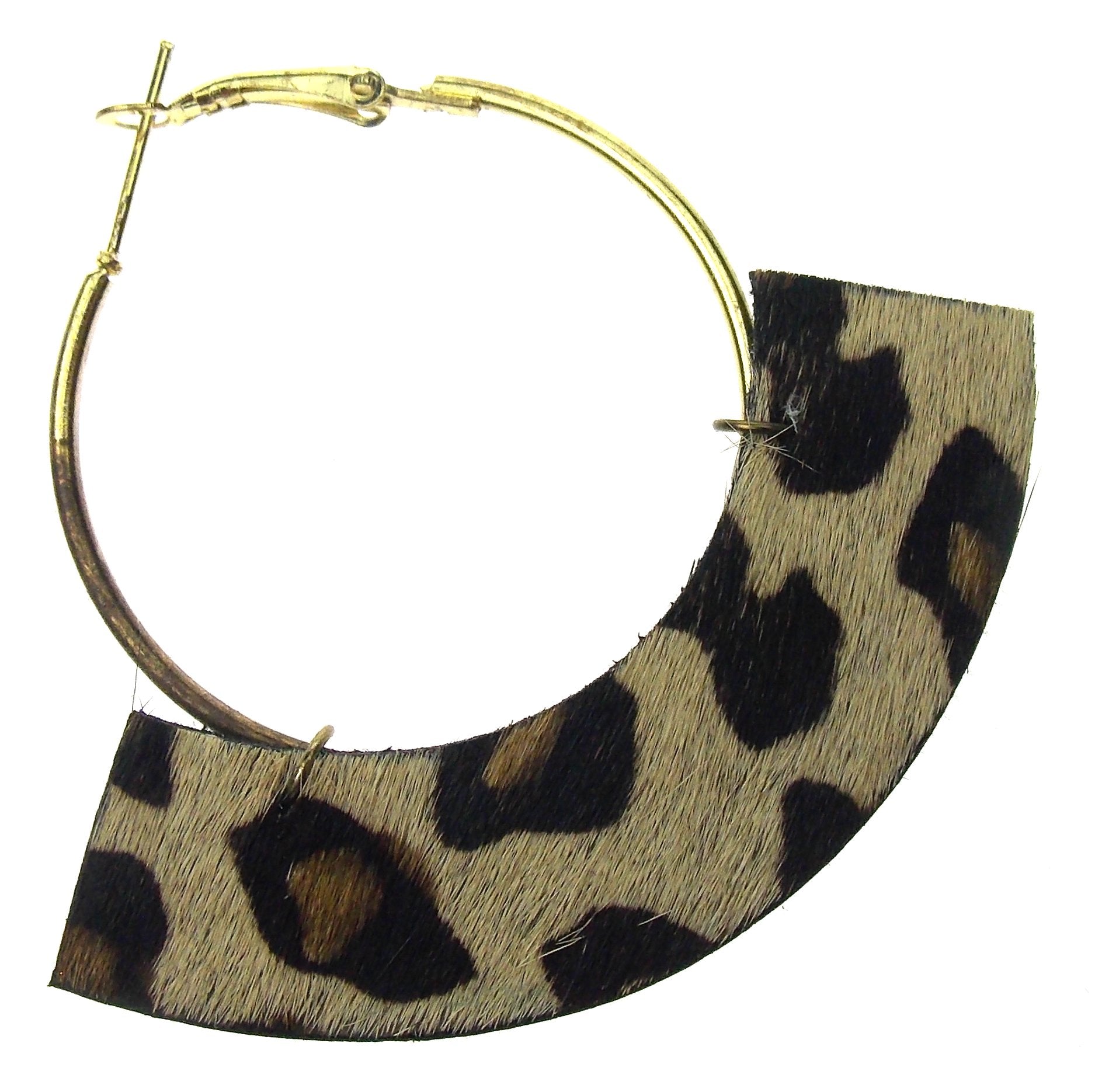 Leather animal print leather hangs down below hoop and is 2 1/2" wide x 5/8" tall.