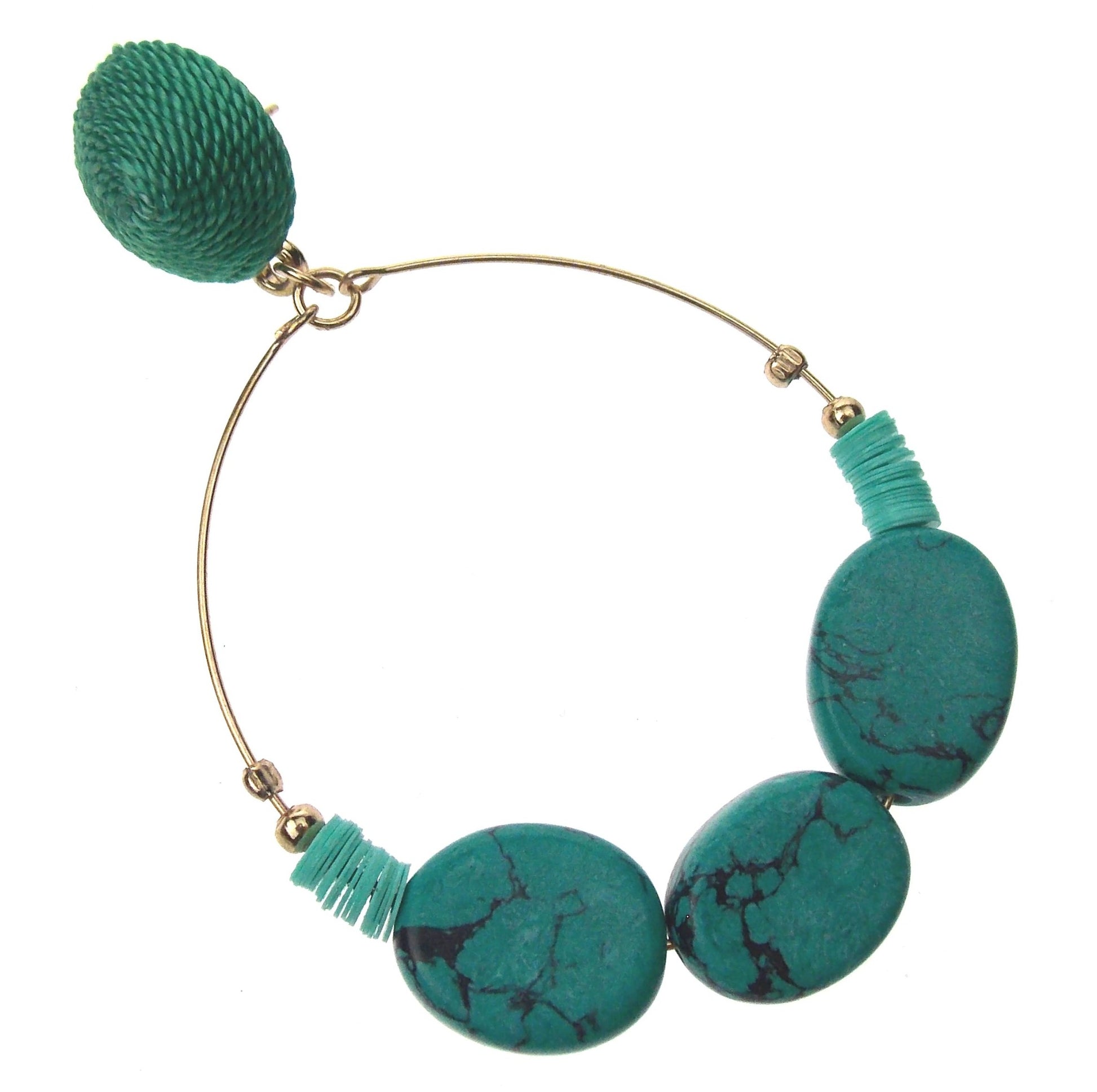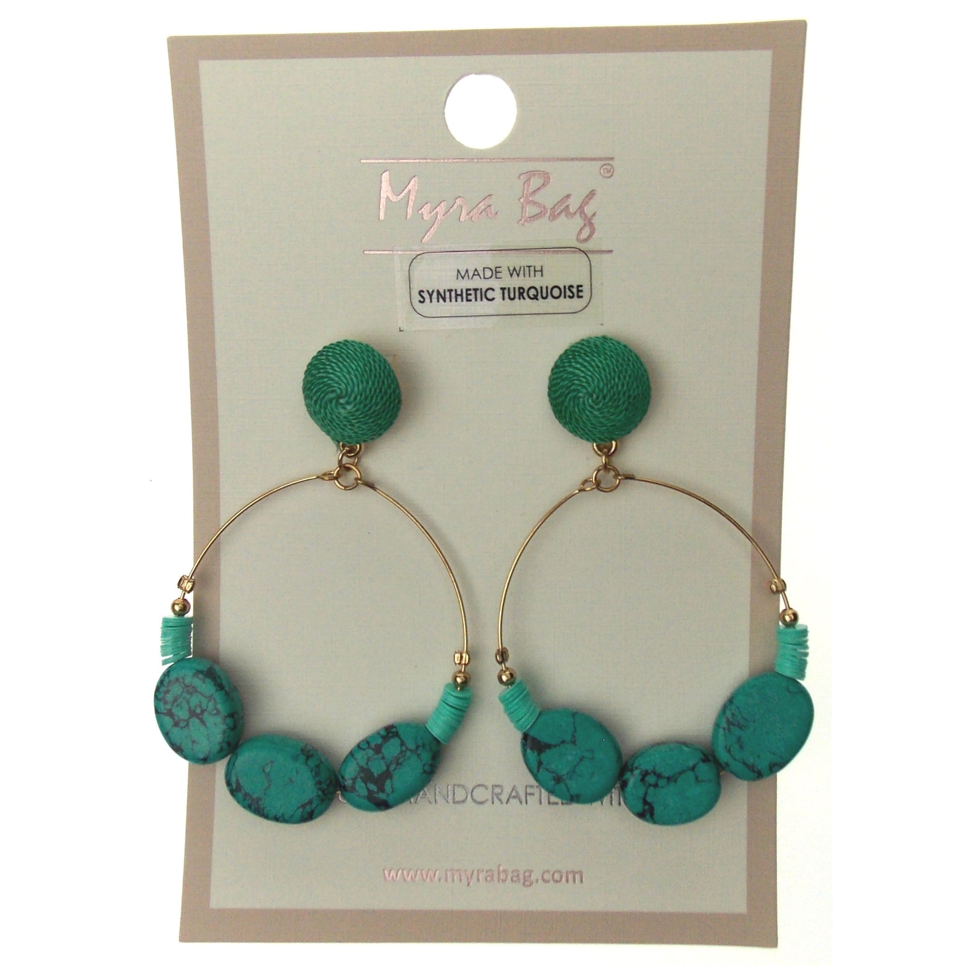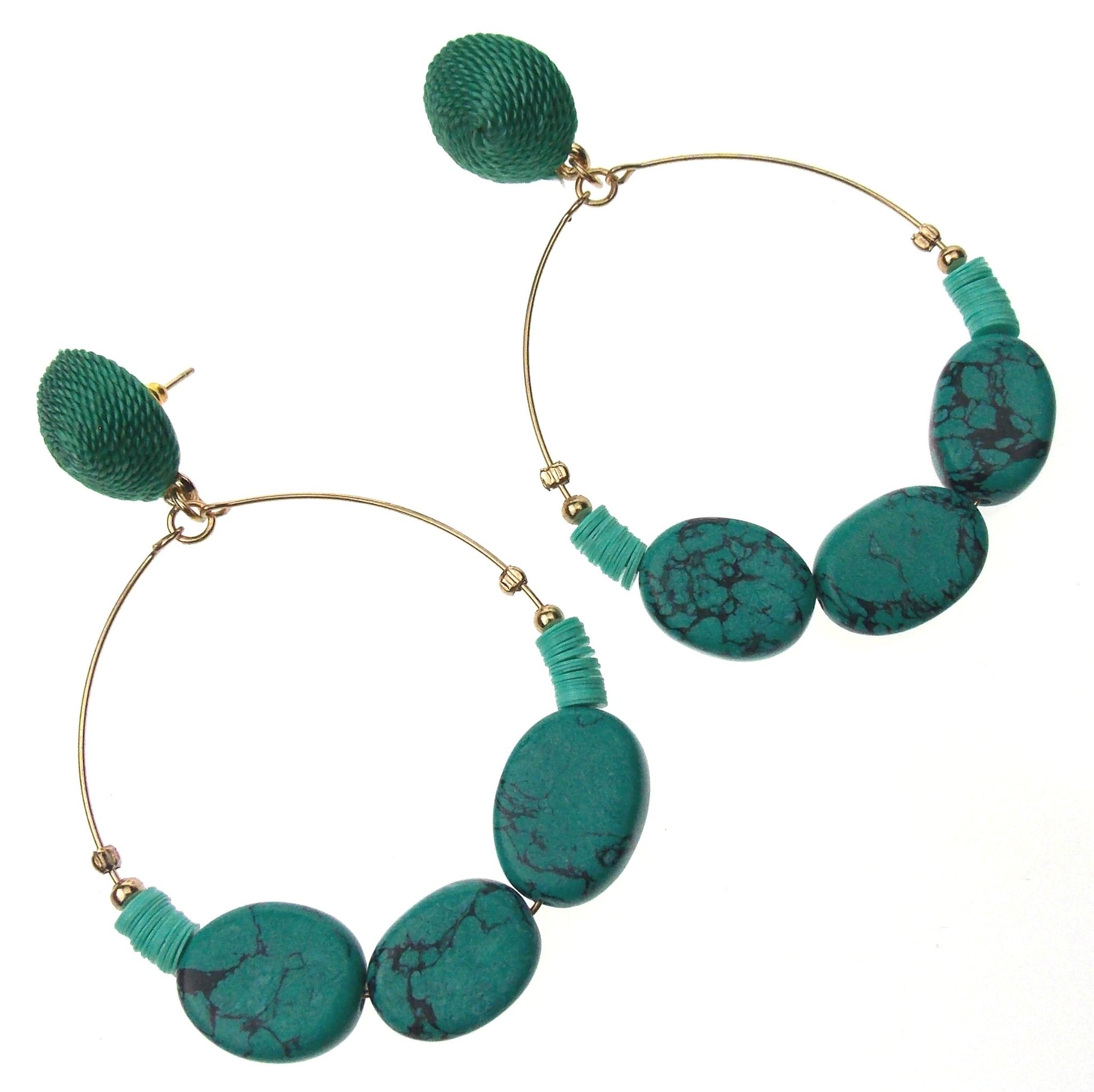 Large hoop at the bottom hangs down 2 1/4". There are 3 Synthetic Turquoise Stones on each earring.