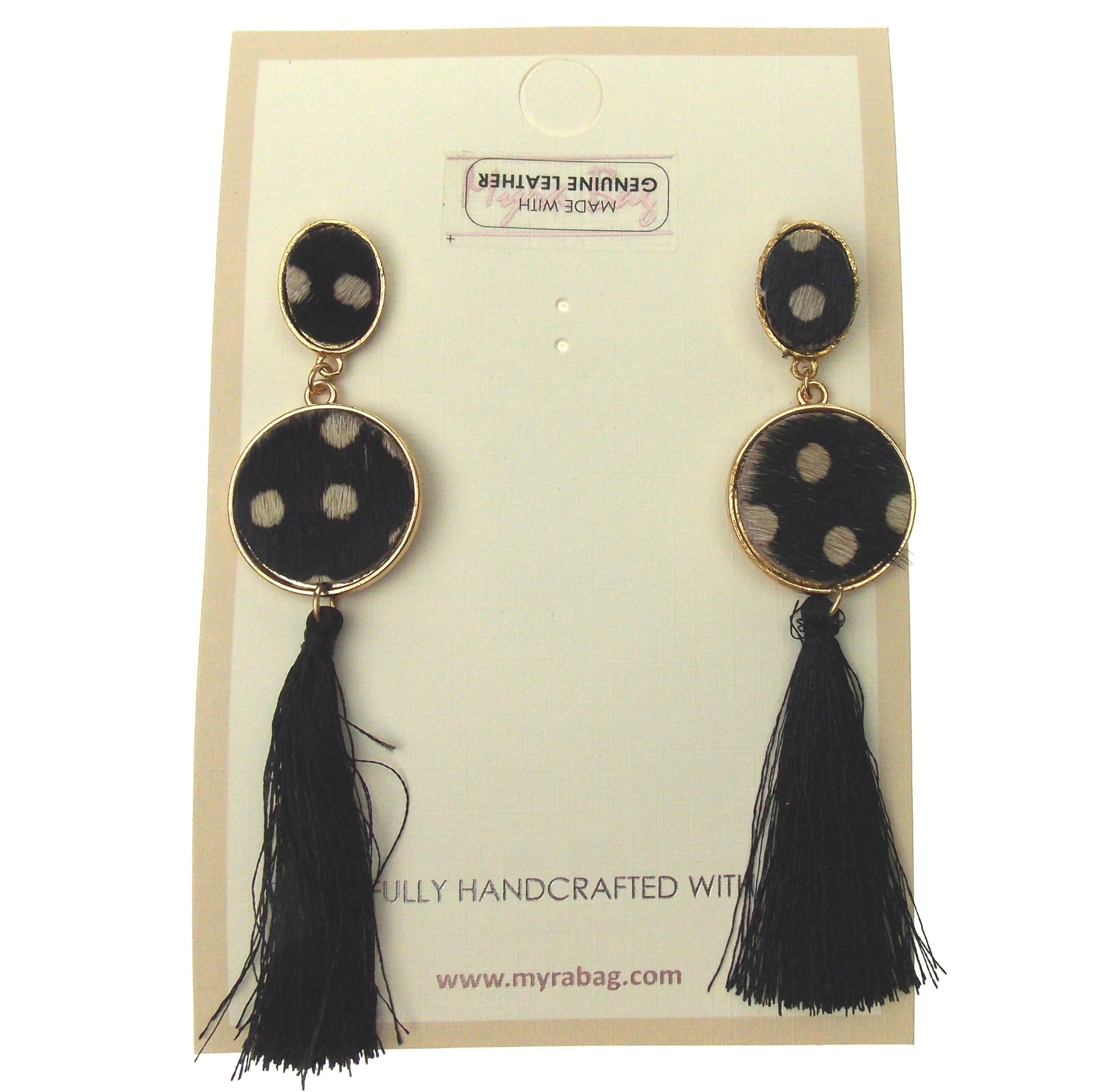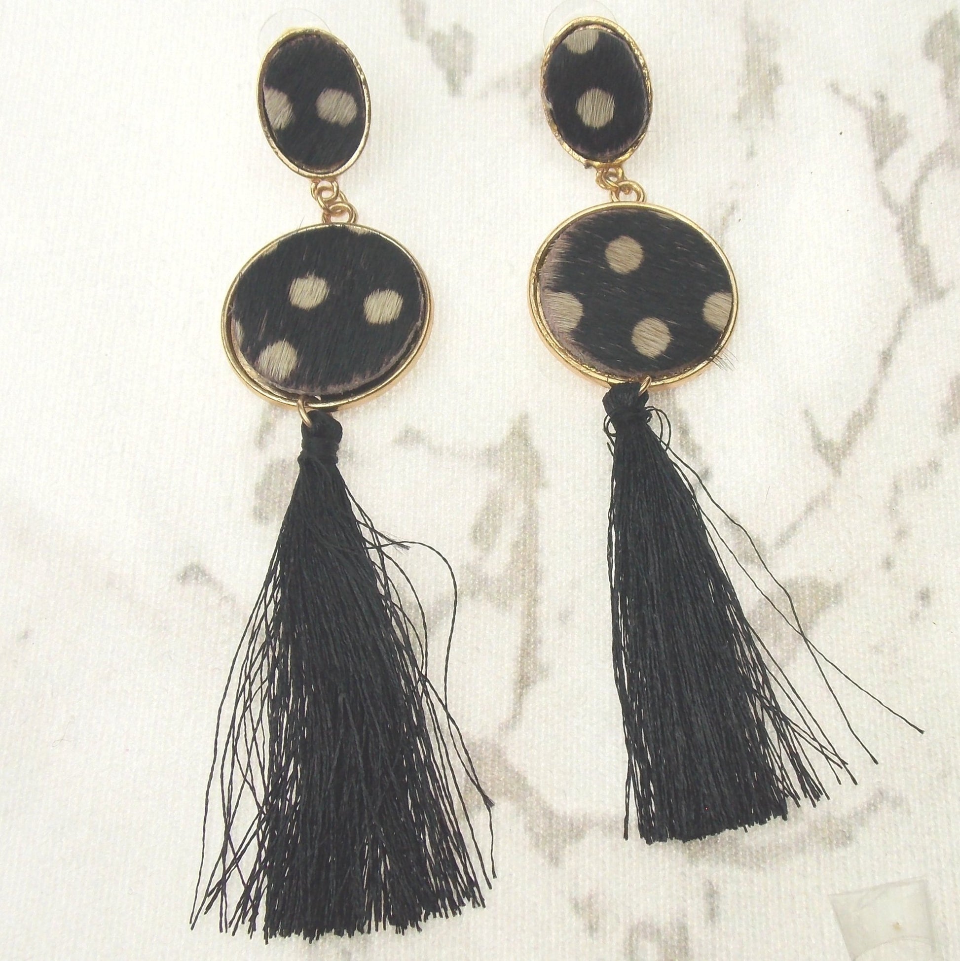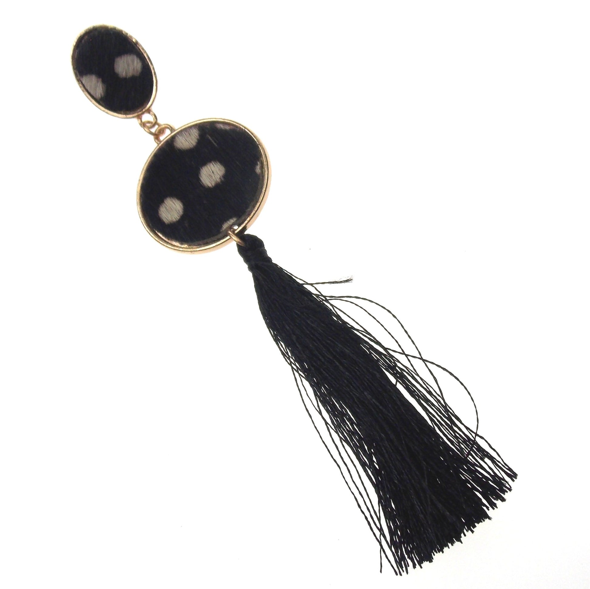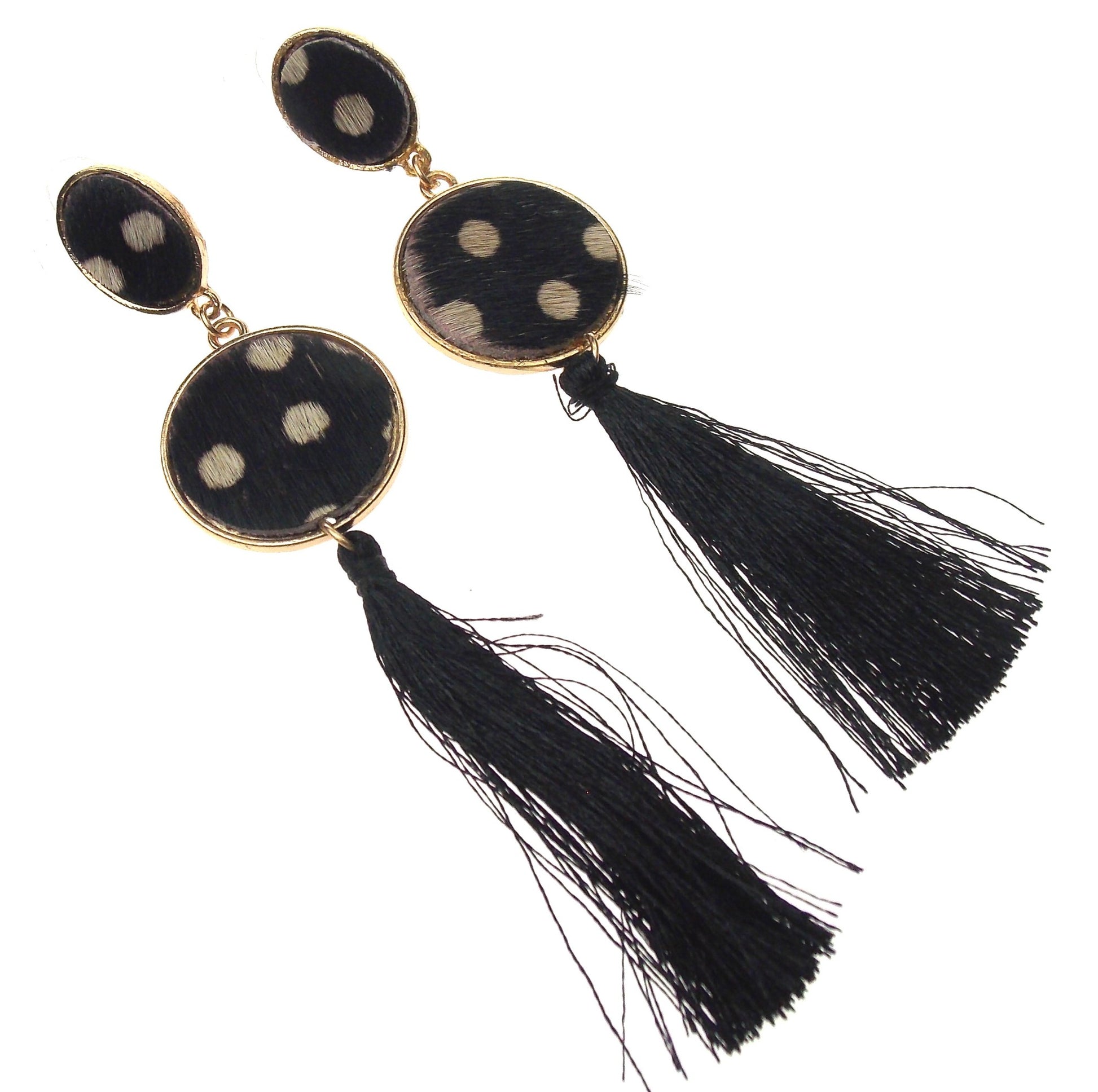 Black frill tassels hang down at the bottom of the earrings. The tassel part is 2 1/4" long.