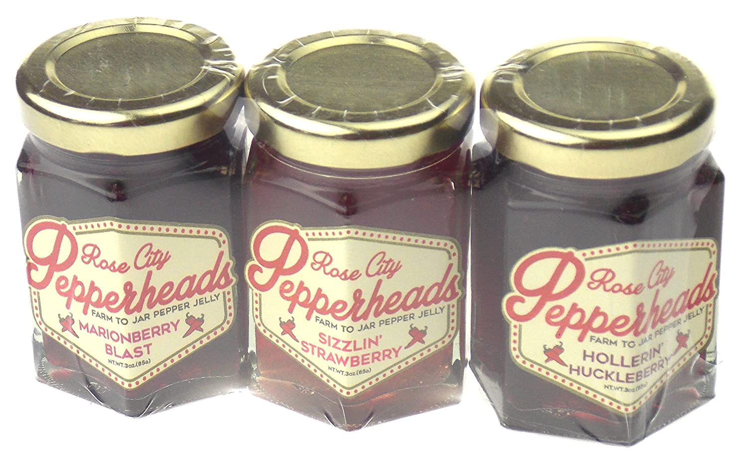 - Bundle Includes: 3 oz Marionberry Blast Jelly, 3 oz Sizzlin' Strawberry Jelly, 3 oz Hollerin' Huckleberry Jelly.