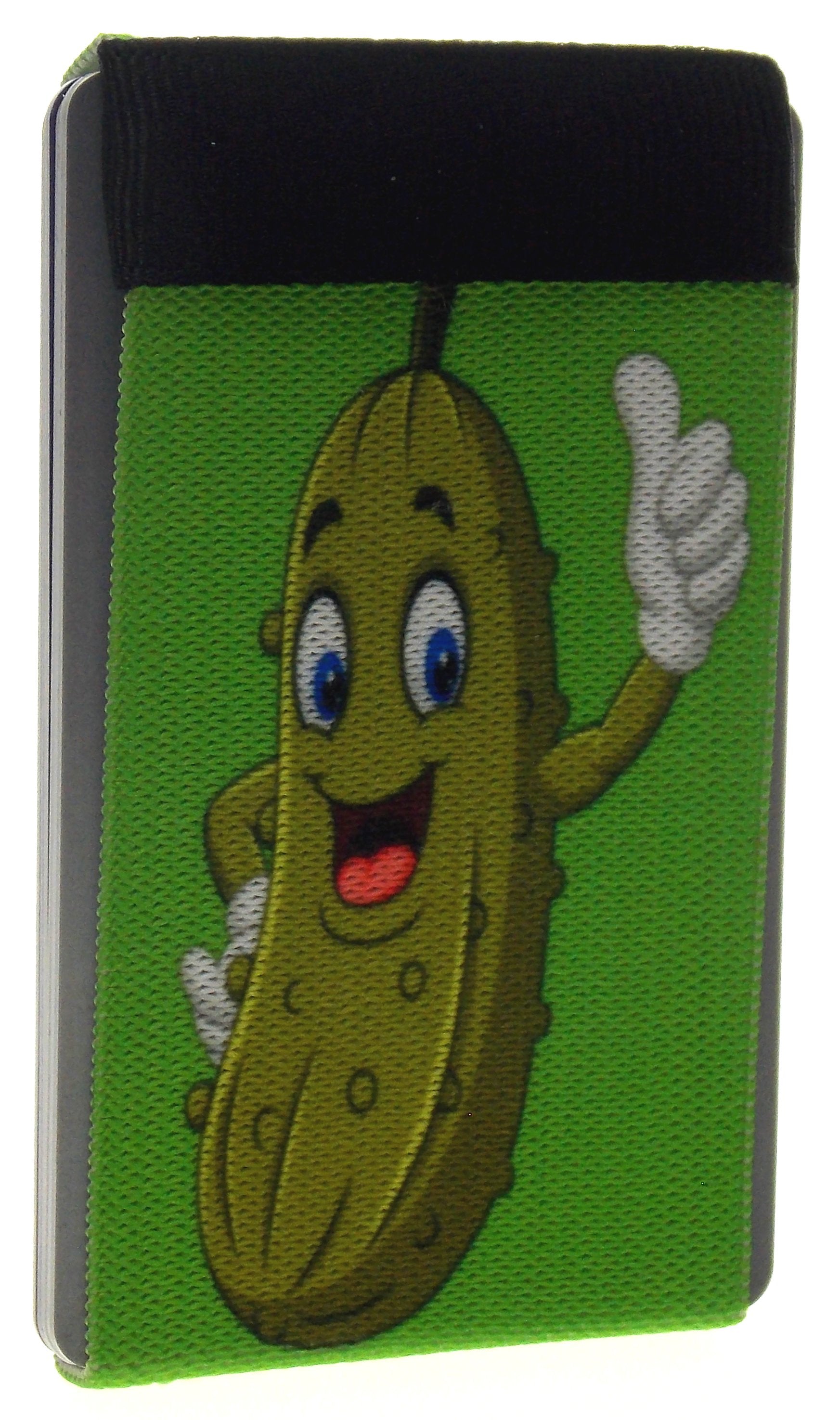 - Front side has an image of a smiling pickle with a Thumb's Up. The background color is light green. The back of the wallet says "I'm Kind Of A Big Dill".