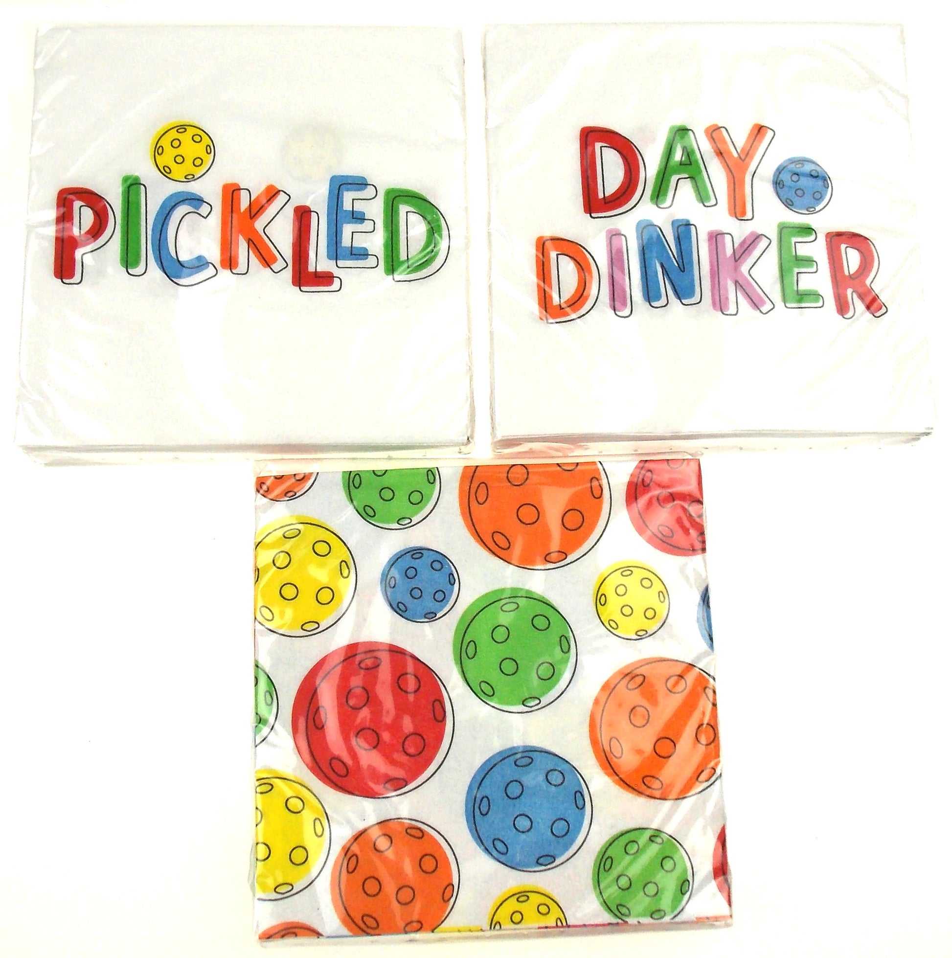 Pickleball Themed Beverage Cocktail Napkins Bundle (3 Designs): Pickled, Day Dinker & Wiffle Ball - 5x5 Inch Square - 3 Packages (60 Napkins Total)