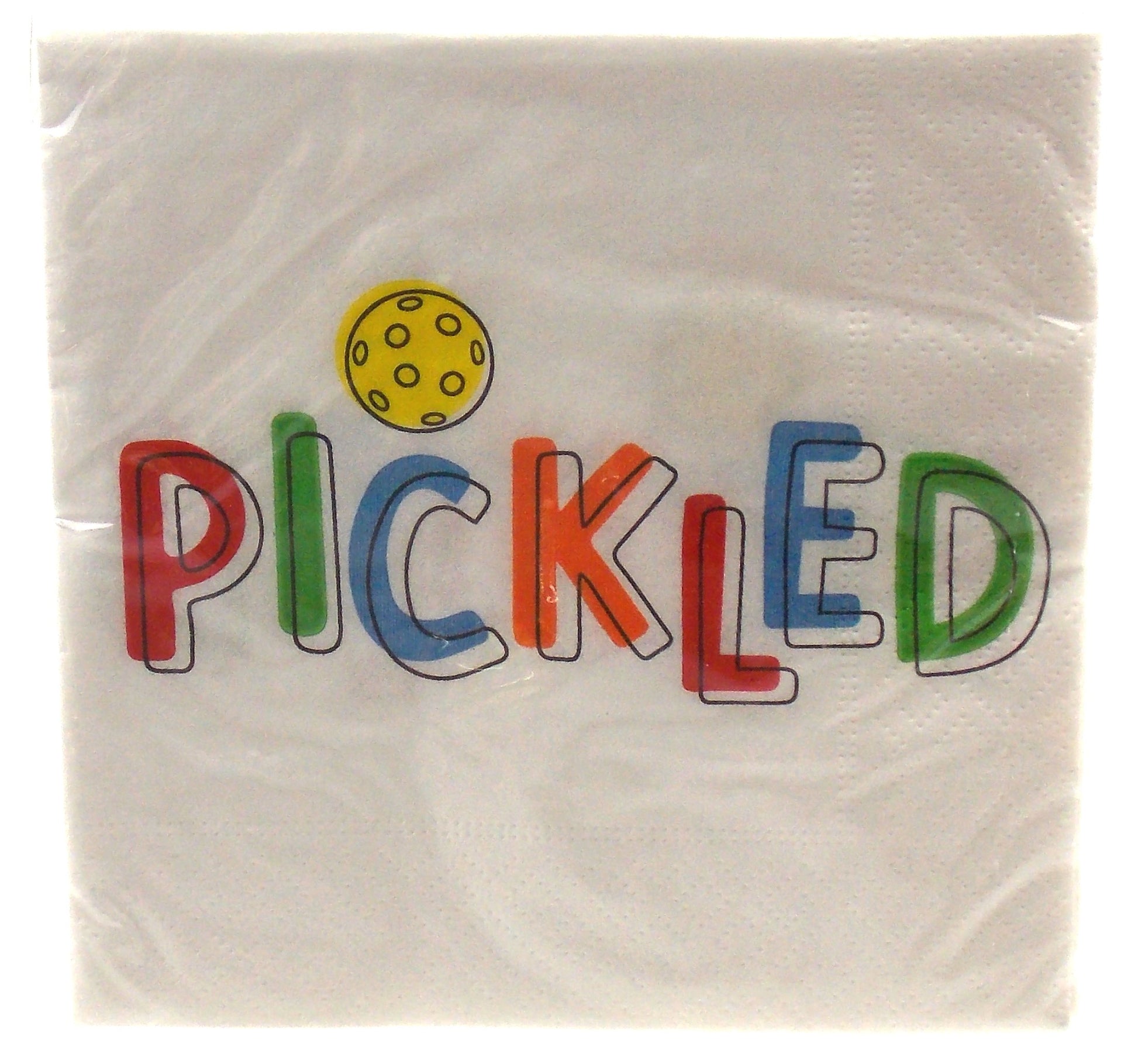 DESIGN 2 – White napkin with “Pickled” colorful design showing images of a yellow pickleball.