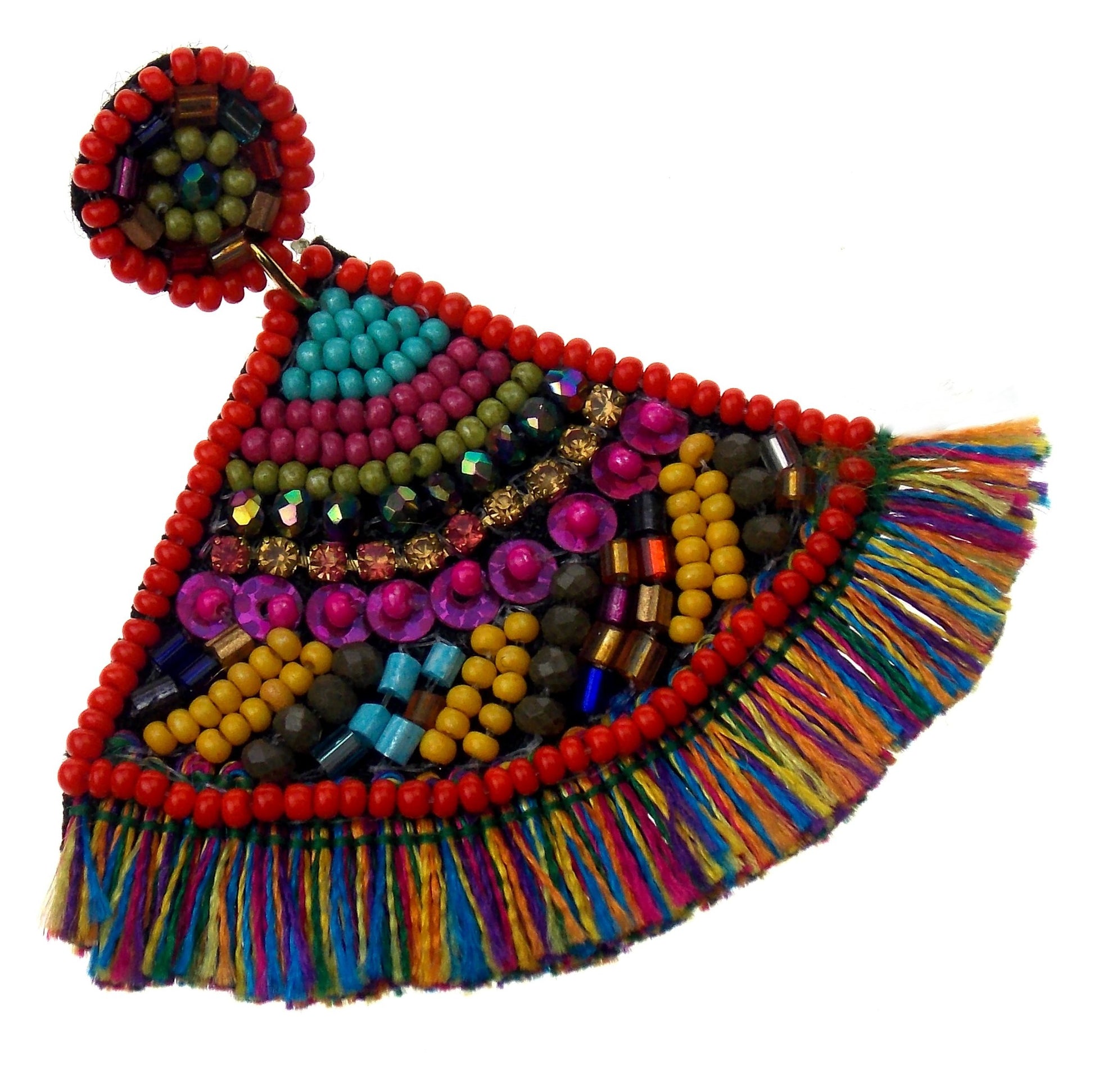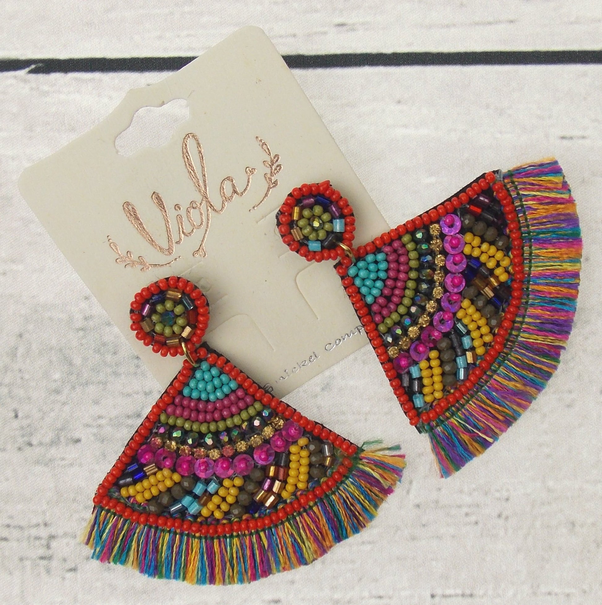 Viola Seed Beads Fan Shaped Earrings Handcrafted Bling Boho Dangle Tassels Gems