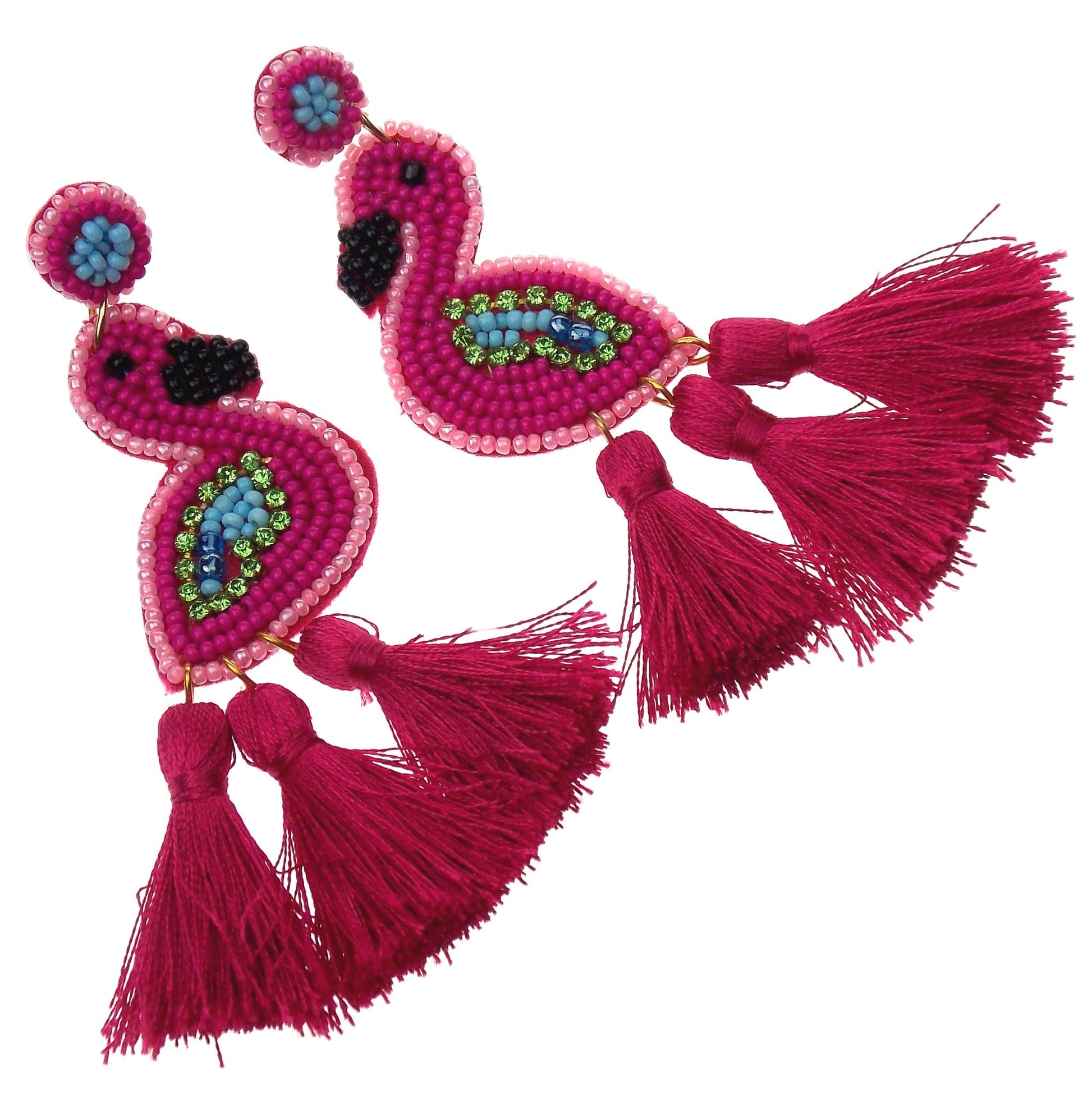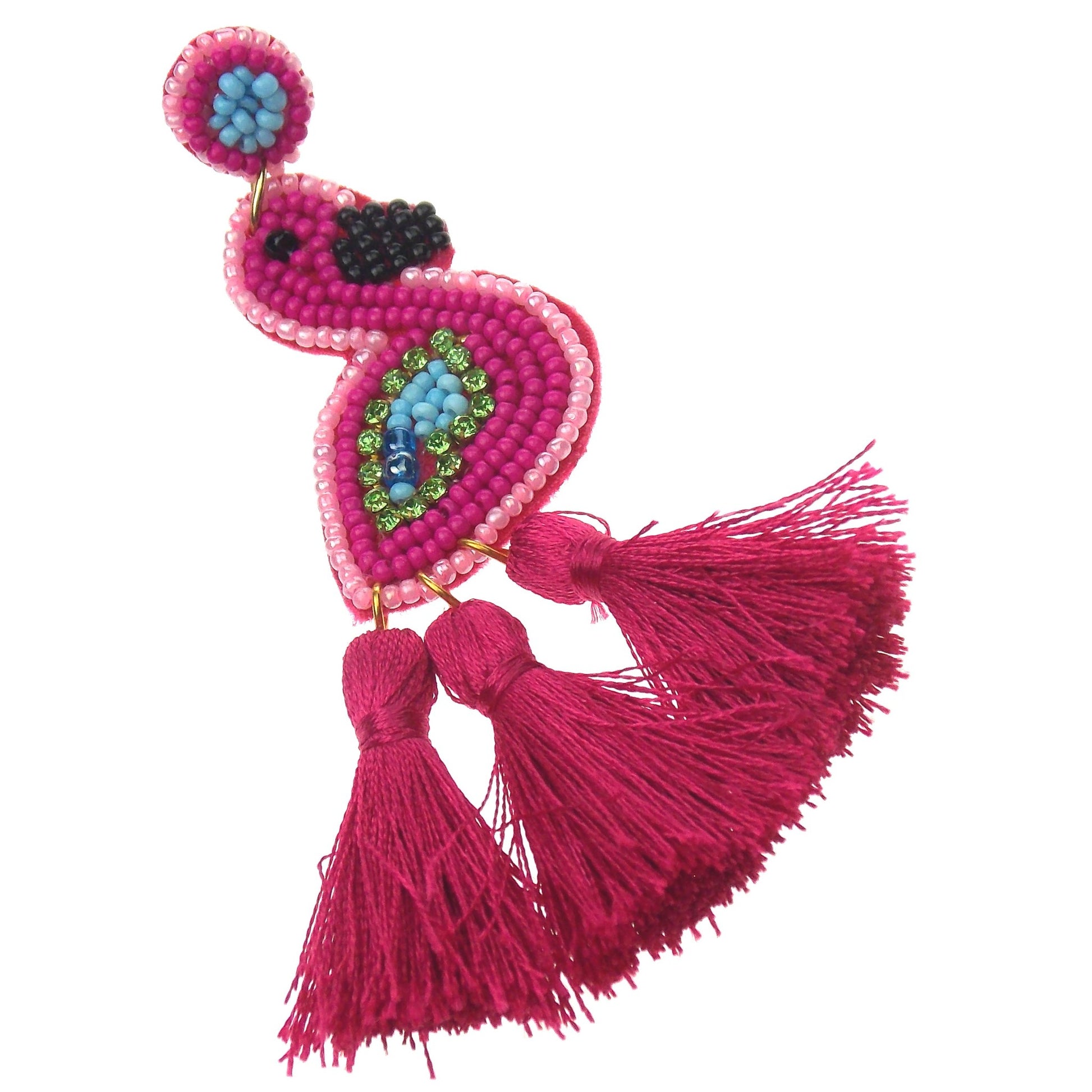 Earrings are made with many beads. Flamingo is pink with some blue and black beads.