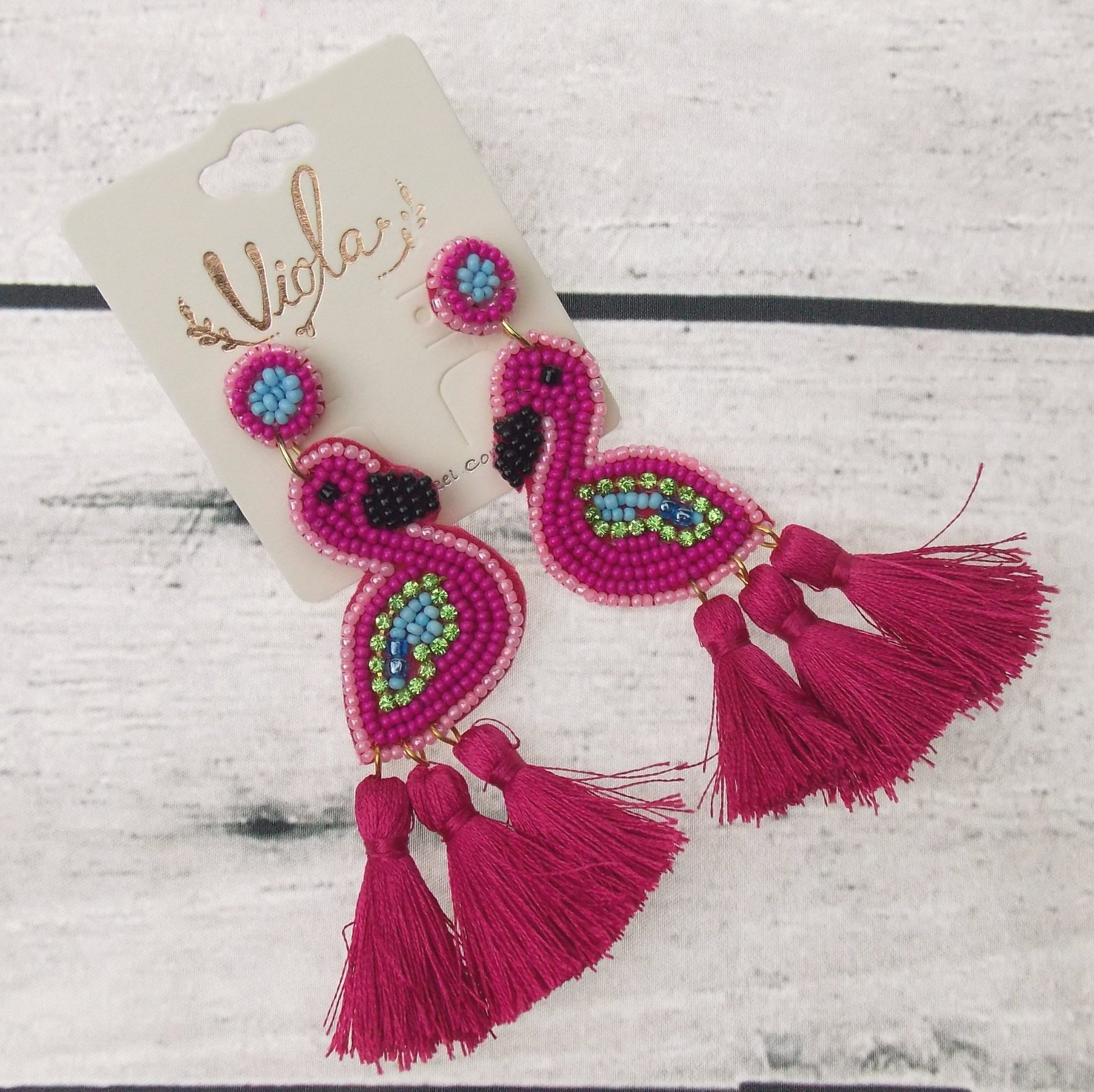 Viola Seed Beads Flamingo Earrings Tassels Handcrafted Bling Boho Fringe Dangle