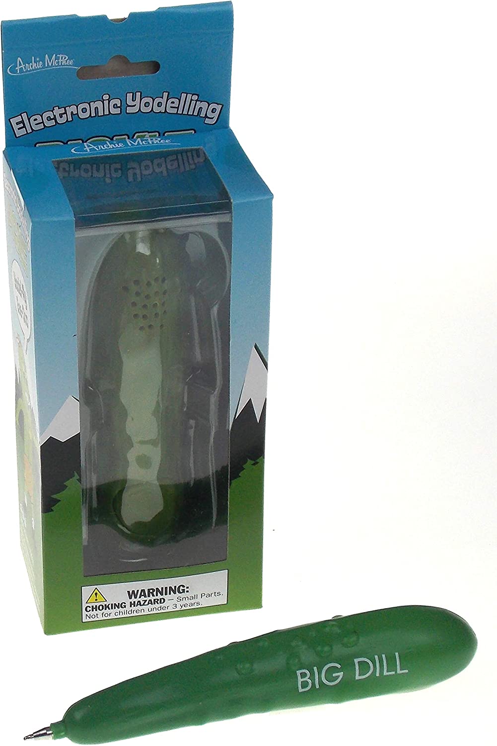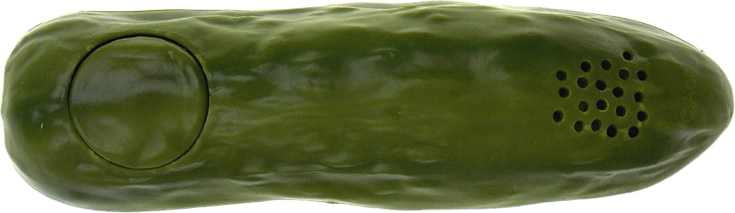 Accoutrements Electronic Yodelling Pickle. Measures 5.25" long x 1.5" diameter. Batteries Included. Hours of mindless entertainment.